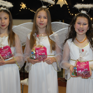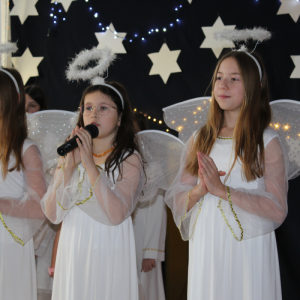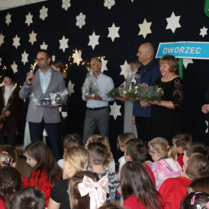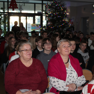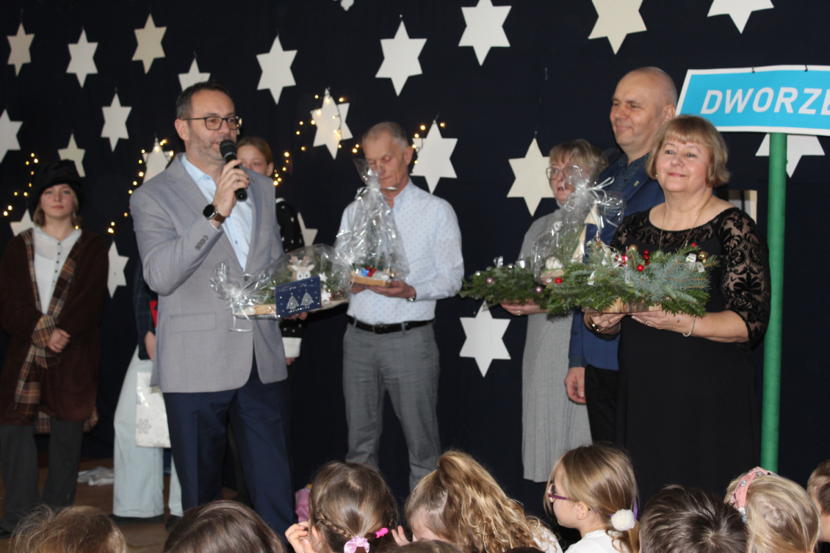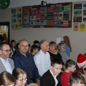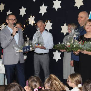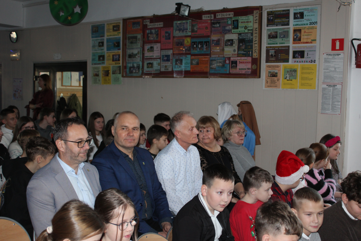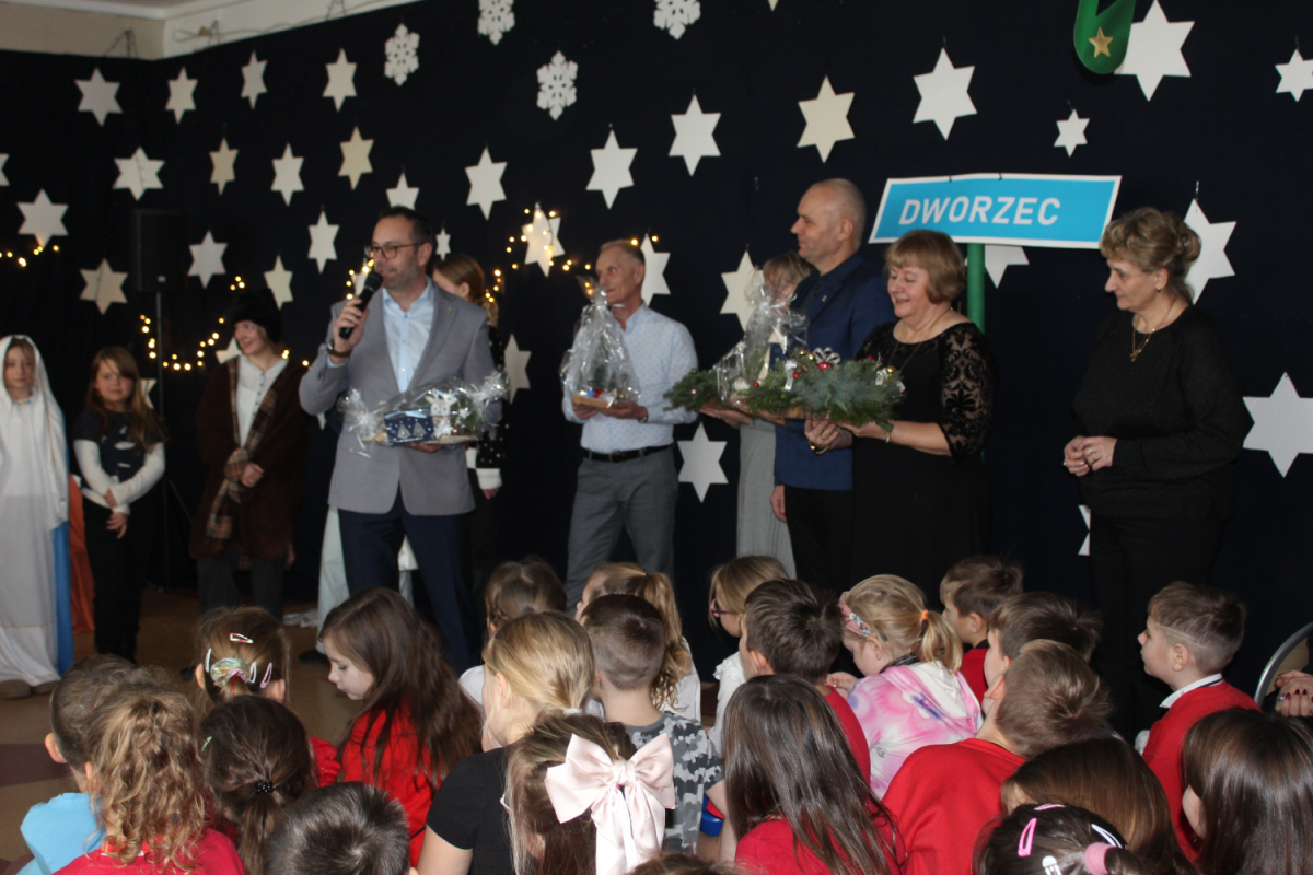 Po zakończeniu przedstawienia głos zabrał Wójt Gminy Olszanka, pan Tymoteusz Drebschok, który podziękował za przepiękny występ, zwrócił uwagę na potrzebę dostrzegania osób potrzebujących oraz złożył wszystkim serdeczne życzenia świąteczne. Zachęcał także uczniów do solidnej nauki i uważnego słuchania nauczycieli. Do jego słów dołączył Przewodniczący Rady Gminy, pan Sławomir Barwiński, który również podziękował za występ, złożył życzenia oraz podkreślił, jak ważne są rodzinne święta i wspólne przygotowania, w które powinna angażować się również młodzież. Następnie życzenia złożył sołtys Olszanki, życząc dzieciom pięknych prezentów pod choinką. Na zakończenie głos zabrała dyrektor Zespołu, pani Bożena Lorent, która zachęcała, aby święta spędzić w gronie rodzinnym, a czas wolny przeznaczyć nie tylko na odpoczynek i przyjemności, ale również na naukę oraz rozwijanie swoich zainteresowań. Po części oficjalnej zaproszeni goście otrzymali świąteczne stroiki, przygotowane przez uczniów, jako wyraz wdzięczności za obecność i pamiątkę tego wyjątkowego spotkania.