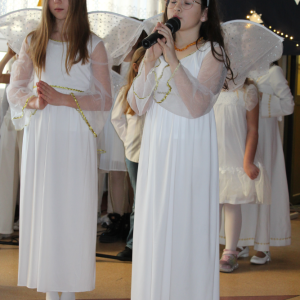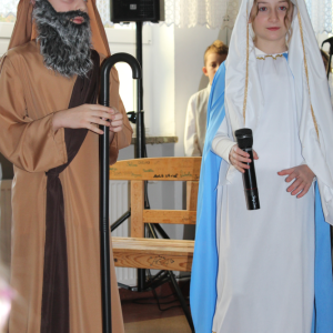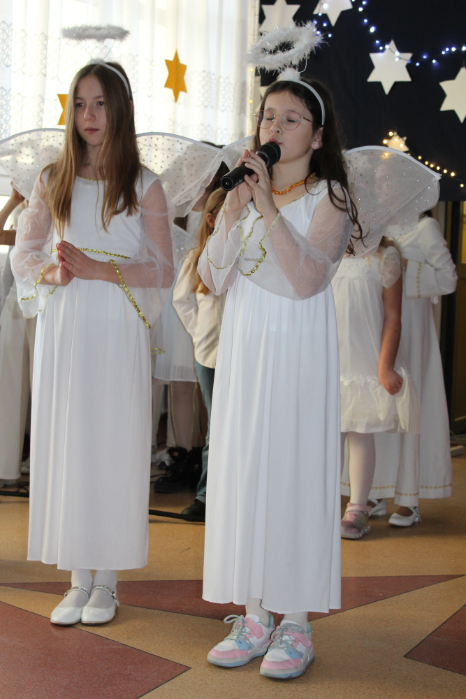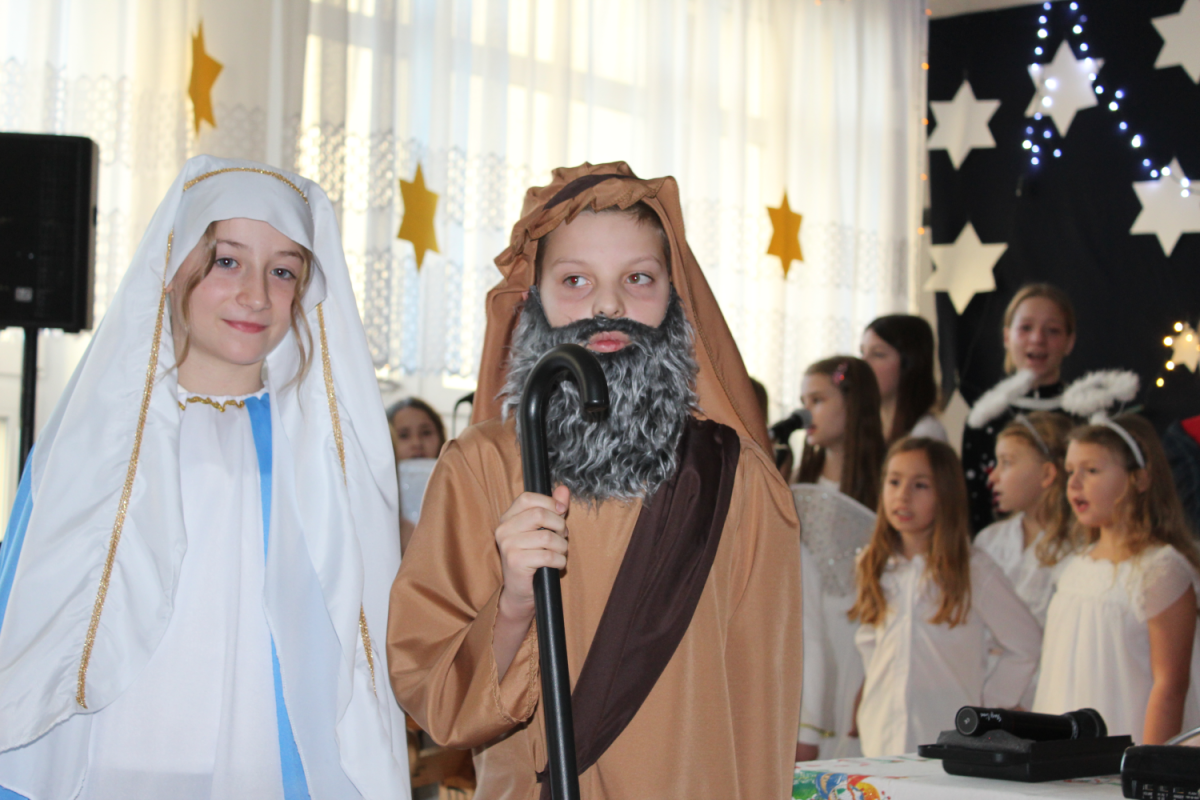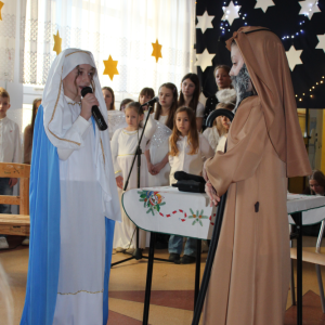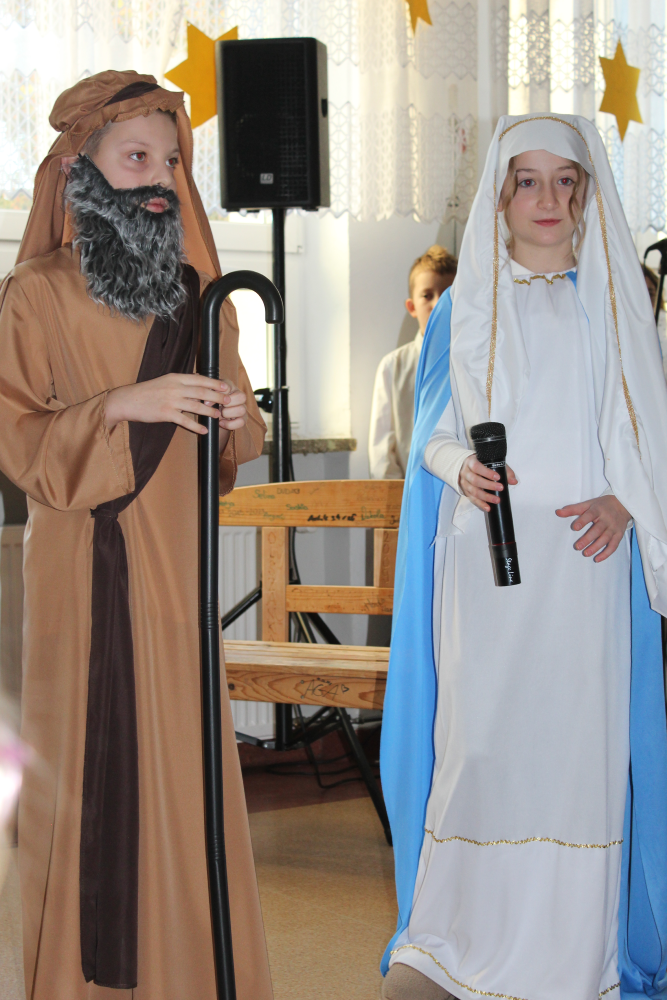z odmową pomocy, a tak naprawdę chcieli niewiele, ot choćby szklankę wody, kromkę chleba. Wśród spotkanych osób XXI w. liczył się jedynie pieniądz, własna wygoda oraz brak wrażliwości na potrzeby drugiego człowieka. Dopiero osoby bezdomne otworzyły swoje serca, przyjęły Maryję i Józefa oraz podzieliły się tym niewielkim dobrem, które same posiadały. Przekaz przedstawienia był niezwykle poruszający i skłaniał do refleksji nad empatią, odpowiedzialnością oraz gotowością niesienia pomocy innym. Między kolejnymi scenami chór szkolny „Słowiki” wykonywał kolędy, które doskonale podkreślały wymowę spektaklu, szczególnie przesłanie zawarte było w słowach „Nie było miejsca…”. Występ spotkał się z bardzo ciepłym odbiorem publiczności i został nagrodzony gromkimi brawami.