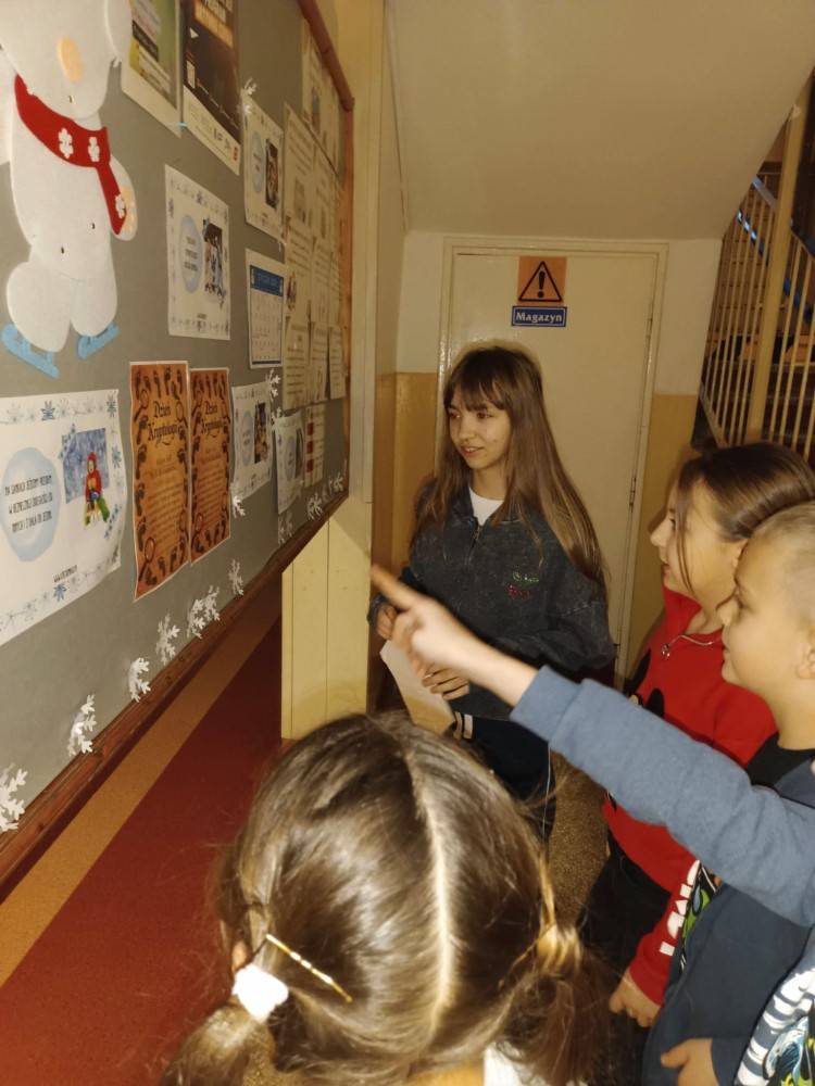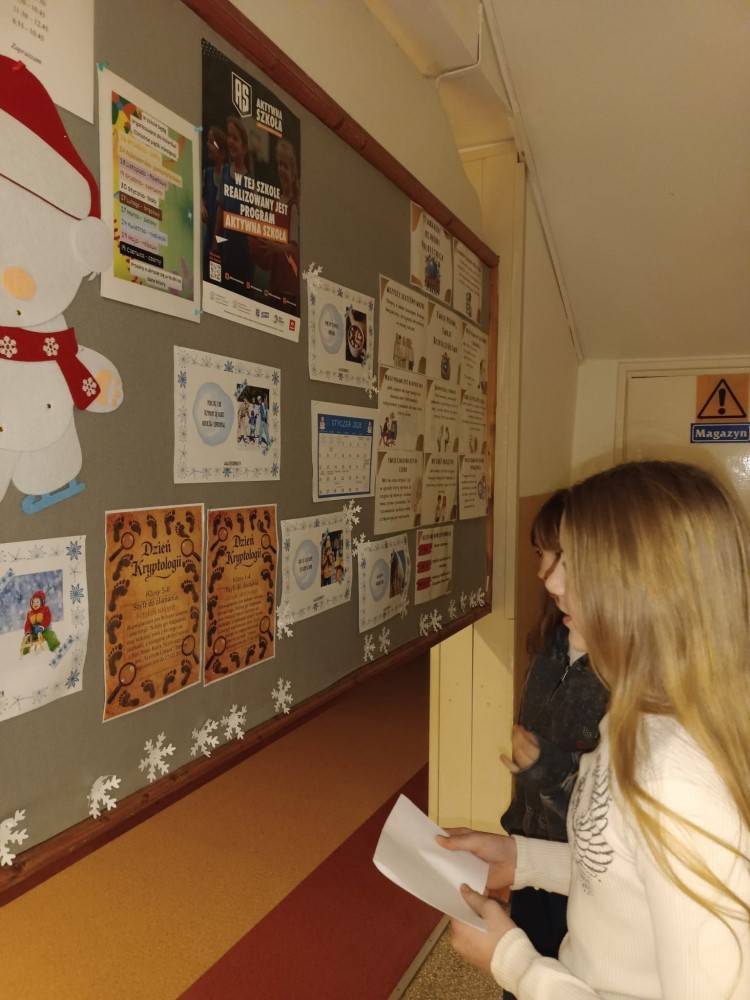 W dniu 27 stycznia 2026 r. odbyły się w naszej szkole obchody Dnia Kryptologii. Z tej okazji uczennica kl. 6 a Aleksandra G./członek Rady SU/ zorganizowała konkurs w kategorii kl. I - IV oraz kl. V - VIII. Uczniowie mieli rozszyfrować hasła zapisane szyfrem Cezara, które zostały zamieszczone na tablicy SU. Do 27 lutego był wyznaczony termin składania odpowiedzi na kartkach. Akcja cieszyła się ogromnym zainteresowaniem uczniów. Zaraz po umieszczeniu ogłoszenia większość uczniów oddawała kartki z poprawnymi odpowiedziami opiekunom SU. Zaszyfrowane hasło dla kl. I- IV to tytuł wiersza „Kaczka dziwaczka” . Natomiast hasło dla kl. V - VIII składało się z dwóch członów: tytułu lektury „Opowieść wigilijna” oraz nazwiska i imienia głównego bohatera „Ebenezer Scrooge”. Nie zabrakło elementów rywalizacji i dobrej zabawy. Całemu wydarzeniu towarzyszyła miła atmosfera. Był to czas, w którym można było przekonać się, że myślenie sprawia ogromną przyjemność.Za rok ponownie zapraszamy do kolejnej rywalizacji w dziedzinie kryptologii.