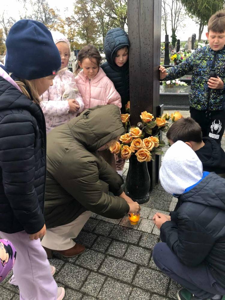 Cmentarz w Pogorzeli, położony tuż za wsią, wśród pól i otoczony starymi drzewami, tego dnia staje się miejscem zadumy, modlitwy i wspomnień. Uczniowie odwiedzili groby swoich bliskich, zmarłych nauczycieli, strażaków oraz osoby szczególnie zasłużone dla lokalnej społeczności. W ciszy, przy szumie wiatru i pod jesiennym słońcem, które nieśmiało przebijało się przez chmury, zapłonęły znicze – symbole pamięci. Spacer był okazją do wspólnej modlitwy oraz rozmów o tych, którzy zapisali się w historii naszych rodzin i miejscowości. Wzruszające chwile nadeszły, gdy niektórzy uczniowie odkrywali, że stoją przy tym samym grobie – bo łączą ich wspólni przodkowie: babcia, dziadek, prababcia czy wujek. Dzieci z radością dzieliły się opowieściami o swoich bliskich, wspominając ich z uśmiechem i ciepłem. Nie zabrakło także pracy – uczniowie z zaangażowaniem porządkowali groby, zbierali liście, poprawiali przewrócone przez wiatr kwiaty. Była to nie tylko lekcja historii i pamięci, ale także wychowania w duchu szacunku, troski i wspólnoty.