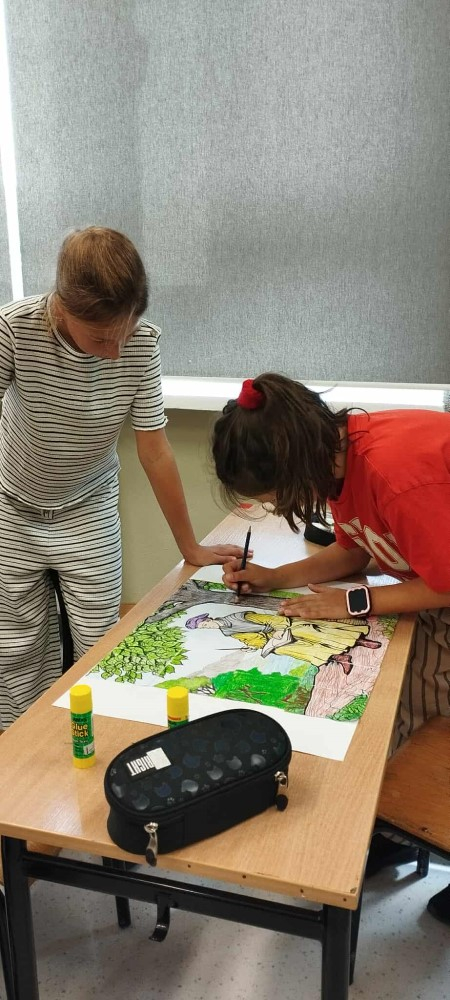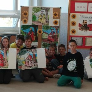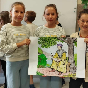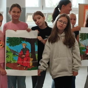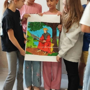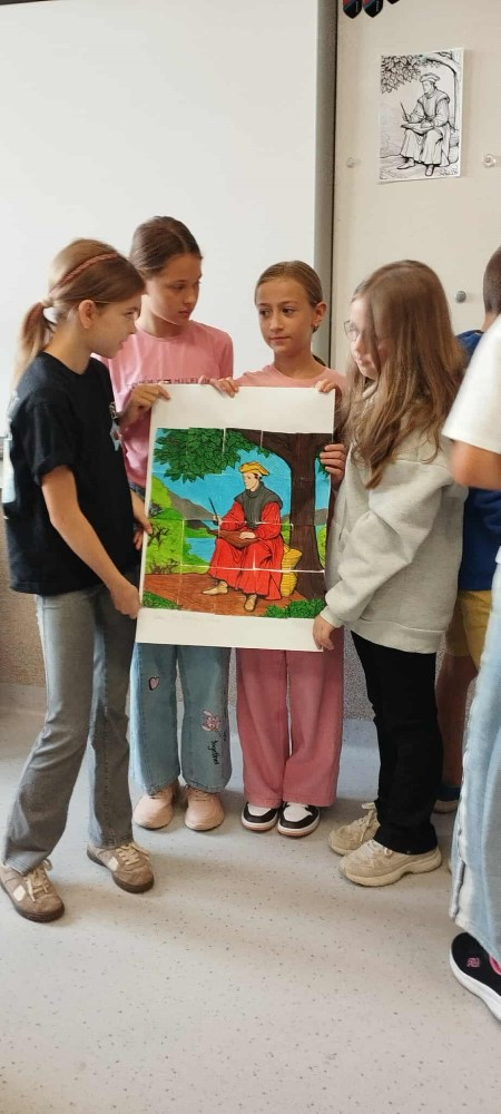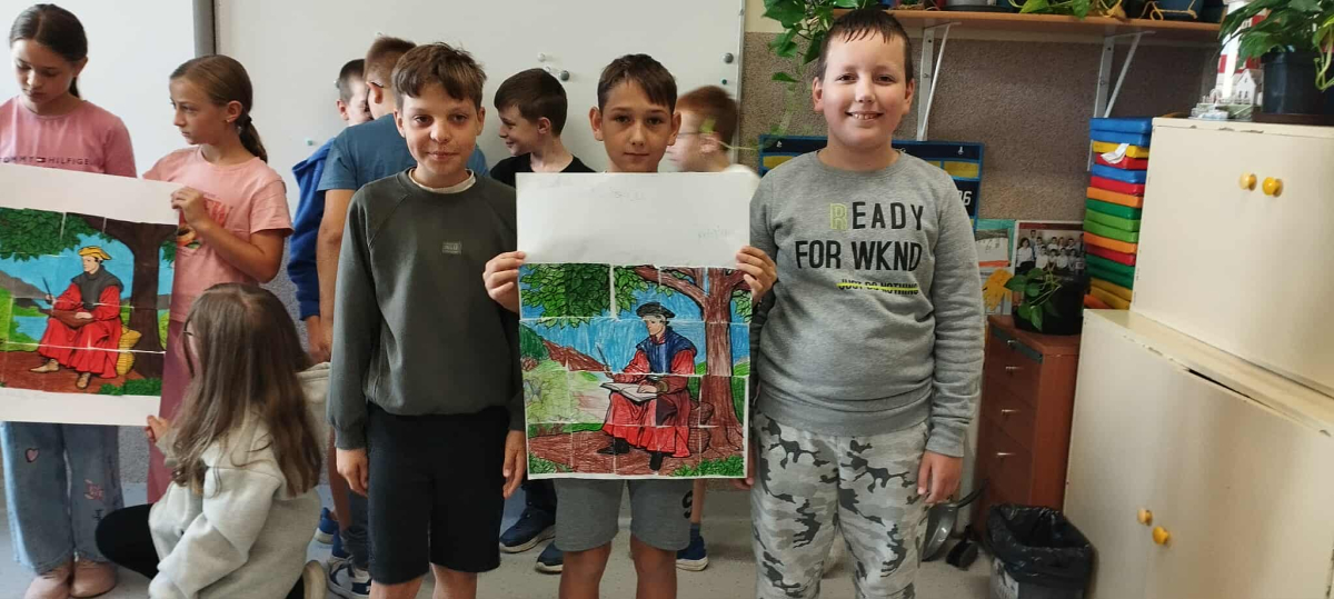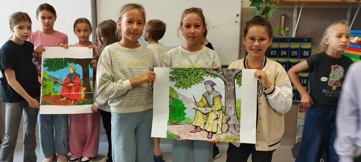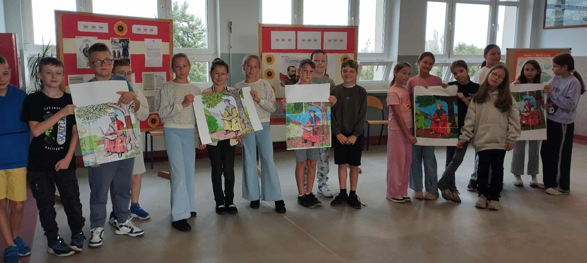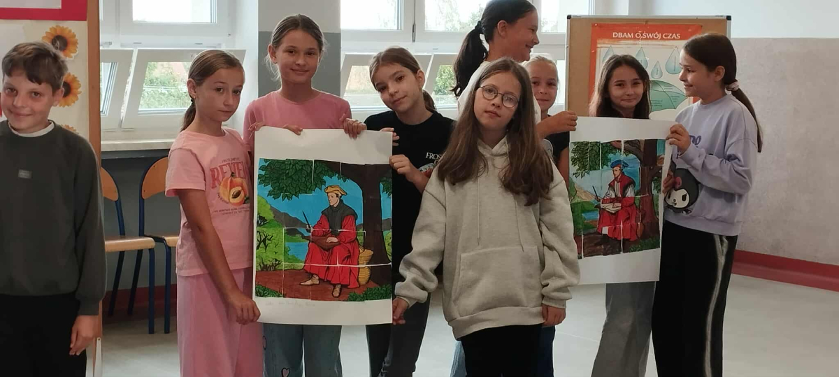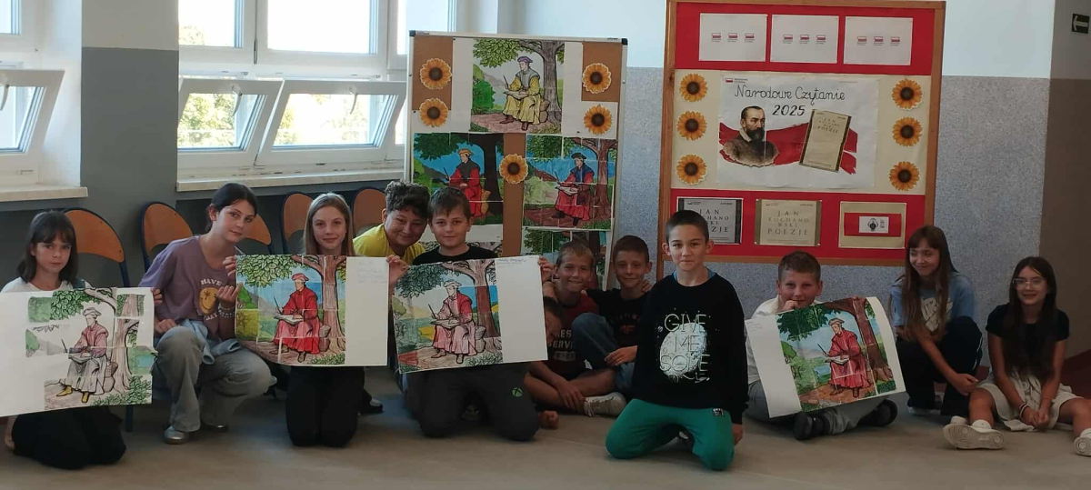 Tegoroczna edycja Narodowego Czytania w Olszance poświęcona była twórczości Jana Kochanowskiego, szczególny nacisk położono na jego fraszki – krótkie, zwięzłe utwory pełne humoru, celnych obserwacji i ponadczasowych spostrzeżeń o ludzkiej naturze. Dla młodszych uczniów przygotowano zajęcia, które łączyły literaturę z aktywnością plastyczną. Podczas gdy nauczyciel czytał wybrane fraszki, dzieci kolorowały fragmenty portretu poety – wcześniej pociętego na 20 elementów przypominających puzzle. Zadaniem uczniów było nie tylko estetyczne pokolorowanie fragmentów, ale również wspólne ustalenie ich kolejności i stworzenie wizerunku renesansowego poety. To kreatywne połączenie słowa i obrazu spotkało się z dużym entuzjazmem uczniów.