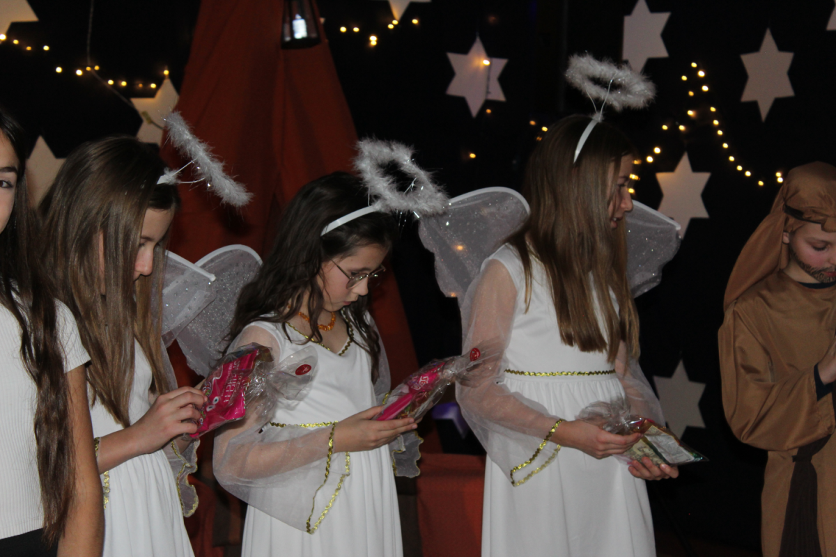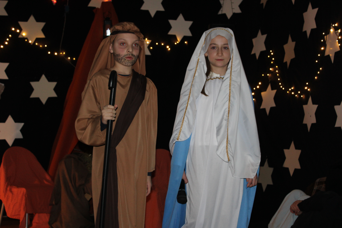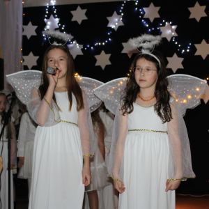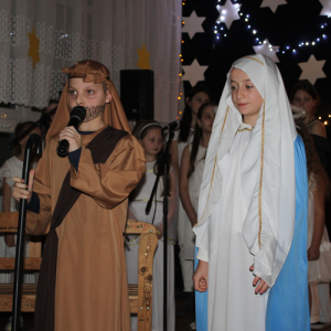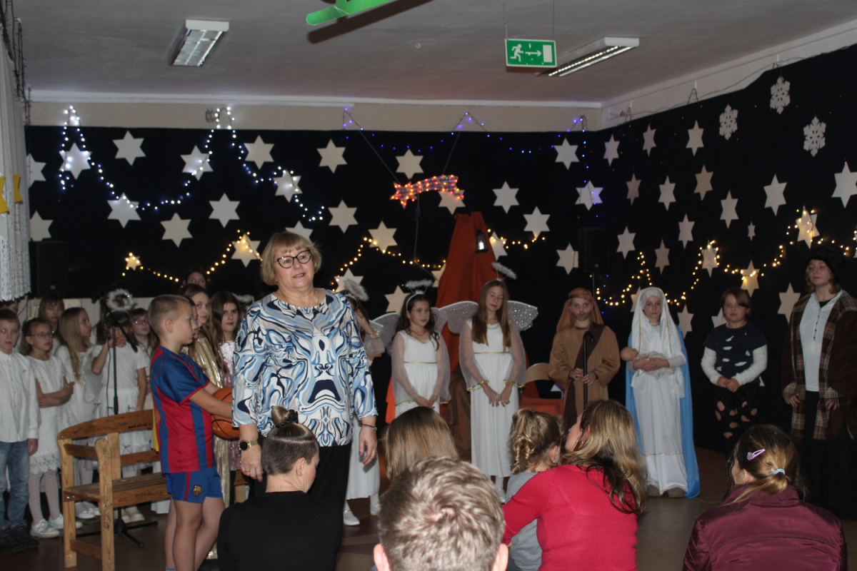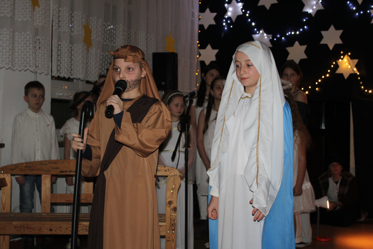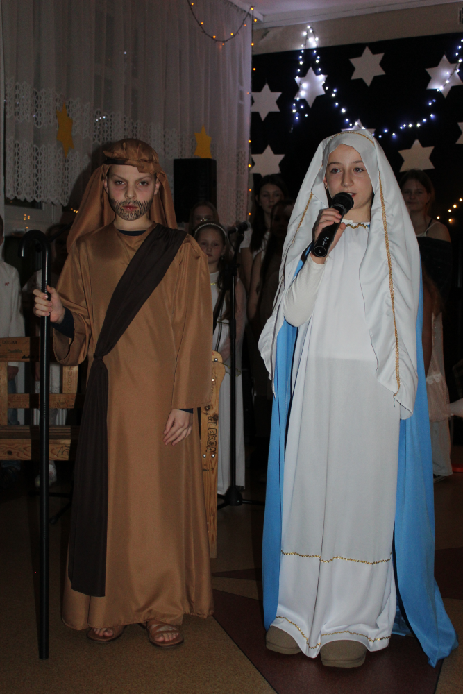 z rodzicami. Wydarzenie to, zwane potocznie „świąteczną wywiadówką”, na stałe wpisało się w kalendarz uroczystości szkolnych i stanowi ważny element budowania wspólnoty szkolnej. Spotkanie rozpoczęło się wyjątkowym przedstawieniem jasełkowym, przygotowanym przez uczniów klasy czwartej i szóstej , pod kierunkiem pani Beaty Kuny oraz pani Ewy Chruszczewskiej. Oprawę muzyczną oraz prowadzenie chóru, który zaprezentował piękne kolędy i pastorałki, powierzono nauczycielce muzyki – pani Beacie Bajce. Tegoroczne jasełka poruszały niezwykle ważne i aktualne problemy społeczne. Uczniowie przedstawili historię Maryi i Józefa poszukujących schronienia w chwili, gdy narodziny Jezusa były już bliskie. Niestety, na swojej drodze spotykali się z odmową pomocy ze strony ludzi zamożnych, posiadających wszystko. Zrozumienie, wsparcie i otwarte serca odnaleźli natomiast