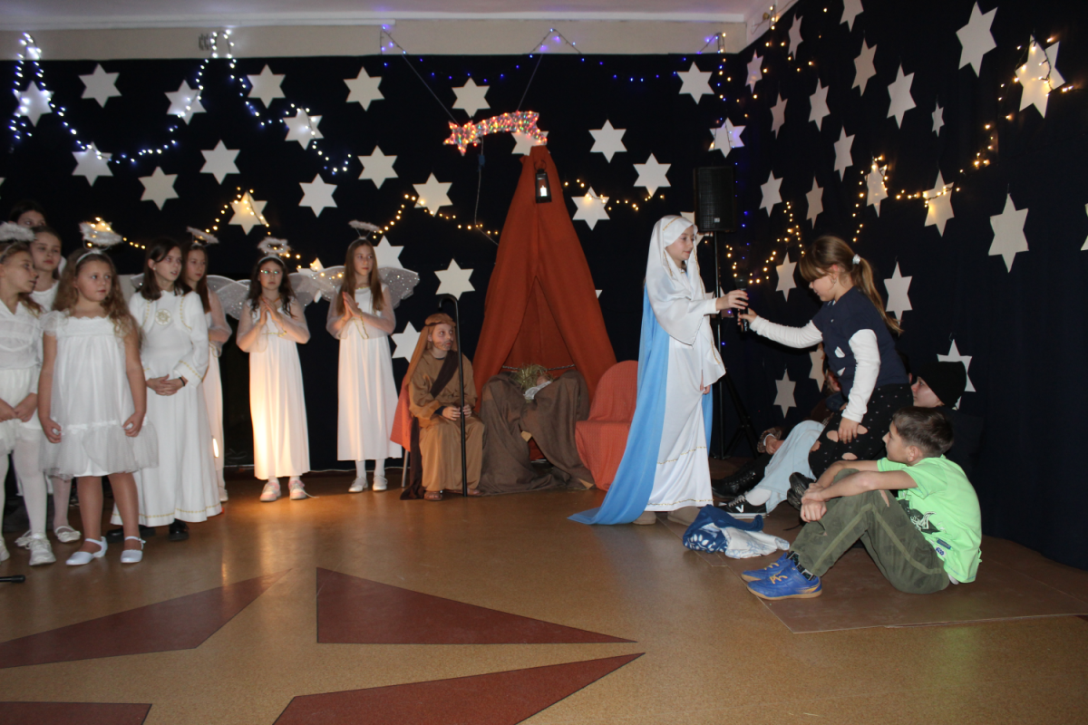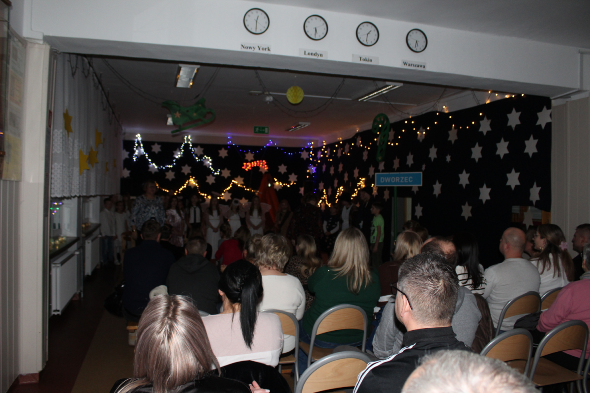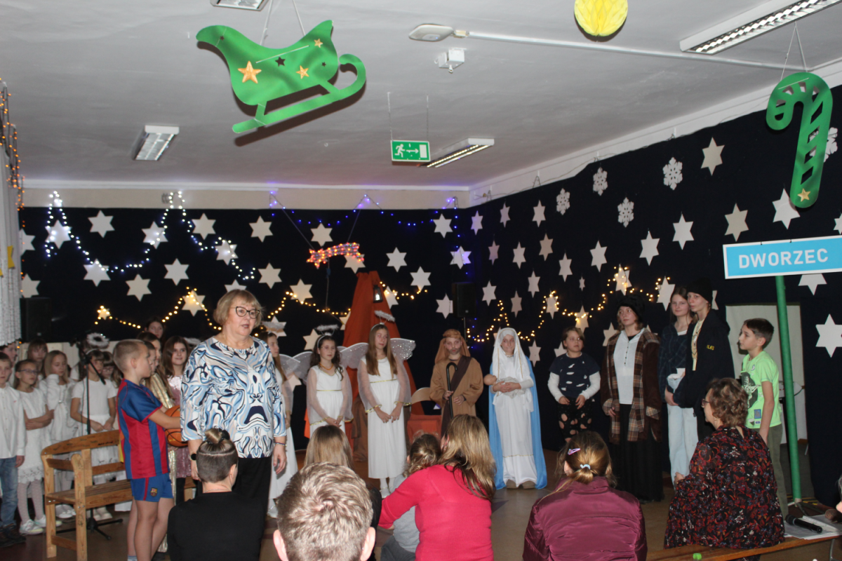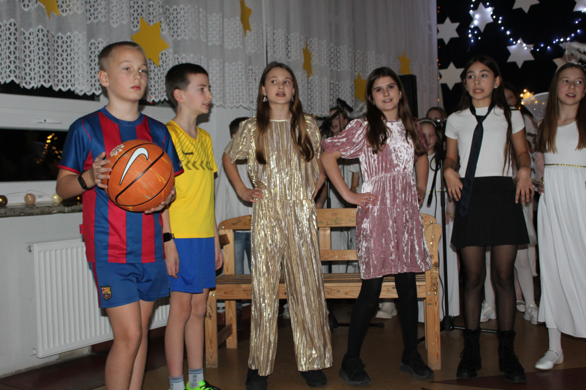 u najuboższych – bezdomnych mieszkających na dworcu, którzy mimo braku własnego domu potrafili okazać prawdziwe miłosierdzie. Przekaz ten skłaniał do refleksji i przypominał o istocie świąt – wrażliwości na drugiego człowieka. Całości towarzyszył wyjątkowy, świąteczny klimat. Jasełka tradycyjnie odbyły się wieczorem w holu szkoły, który został pięknie udekorowany. Rozgwieżdżone niebo, w tle szopka oraz gwiazda betlejemska stworzyły nastrojową i wzruszającą oprawę wydarzenia.
