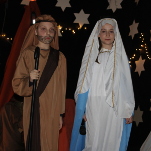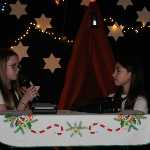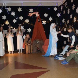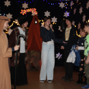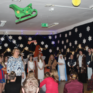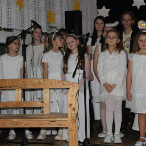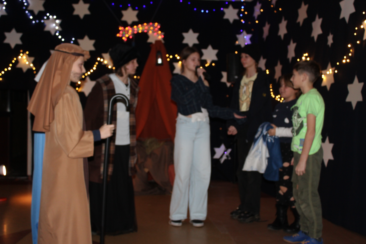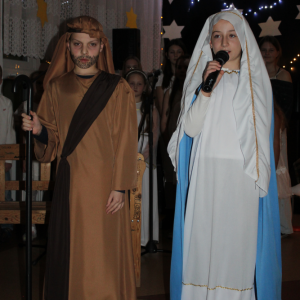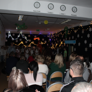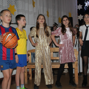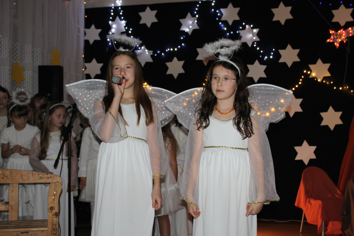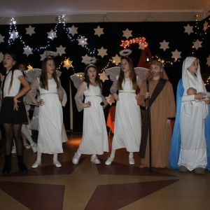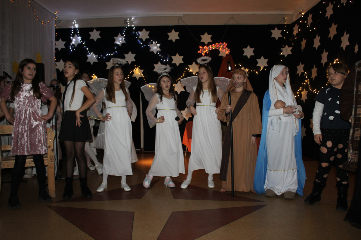 u najuboższych – bezdomnych mieszkających na dworcu, którzy mimo braku własnego domu potrafili okazać prawdziwe miłosierdzie. Przekaz ten skłaniał do refleksji i przypominał o istocie świąt – wrażliwości na drugiego człowieka. Całości towarzyszył wyjątkowy, świąteczny klimat. Jasełka tradycyjnie odbyły się wieczorem w holu szkoły, który został pięknie udekorowany. Rozgwieżdżone niebo, w tle szopka oraz gwiazda betlejemska stworzyły nastrojową i wzruszającą oprawę wydarzenia.
