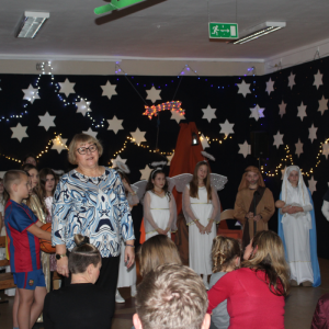 Po zakończeniu przedstawienia głos zabrała dyrektor Zespołu – pani Bożena Lorent, która złożyła wszystkim serdeczne życzenia świąteczne, życząc zdrowia, spełnienia marzeń oraz spokojnego odpoczynku w gronie najbliższych. Następnie wystąpiła przedstawicielka Rady Rodziców – pani Ewa Wasilewska-Zielińska, która w imieniu zaprzyjaźnionej Grupy Otmuchów wręczyła młodym artystom słodkie upominki. Serdecznie dziękujemy Grupie Otmuchów za okazane wsparcie i sprawienie dzieciom ogromnej radości. Po części artystycznej rodzice zostali zaproszeni do klas swoich dzieci, gdzie mieli możliwość zapoznania się z przewidywanymi ocenami z przedmiotów i zachowania oraz omówienia najważniejszych spraw dotyczących uczniów i poszczególnych klas. Spotkanie miało na celu nie tylko przekazanie informacji dydaktycznych, ale również integrację społeczności szkolnej, umocnienie współpracy między szkołą a rodzicami oraz wspólne przeżywanie wyjątkowego, świątecznego czasu.