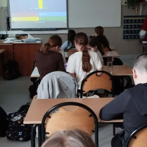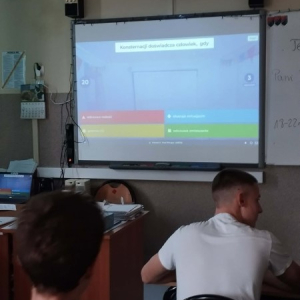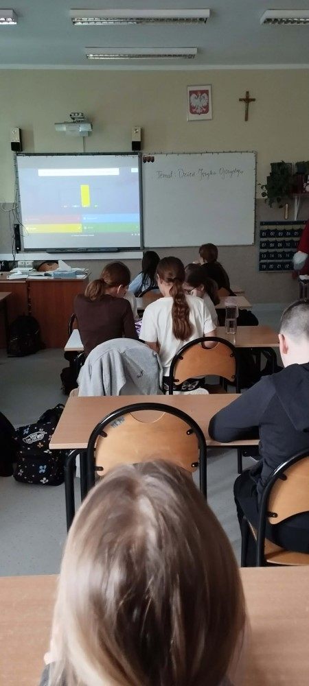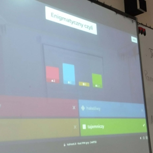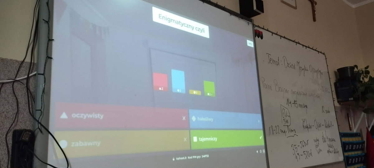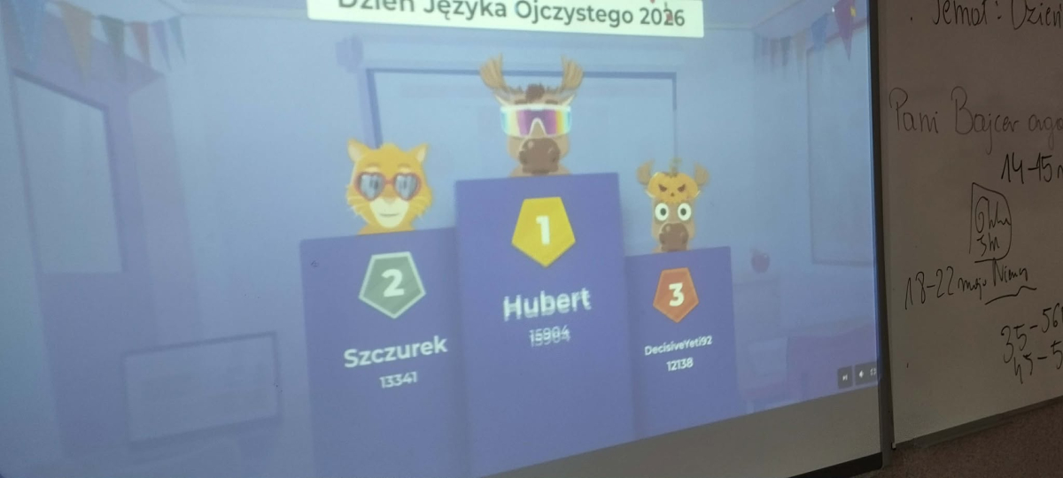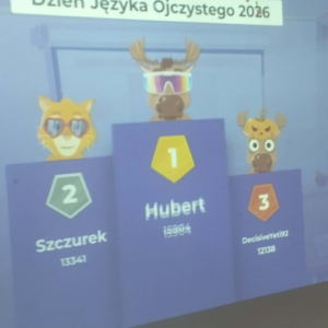 Podczas lekcji odbyły się polonistyczne zmagania w formie quizów na platformie Kahoot. Uczniowie mieli okazję sprawdzić swoją wiedzę oraz zmierzyć się z różnymi wyzwaniami językowymi. Starsze klasy rozpoznawały znaczenie trudniejszych słów, takich jak autorytarny, ambitny, antagonizm, pejoratywny czy elokwentny. Dzięki temu mogli wzbogacić swoje słownictwo, a przy okazji nie zabrakło śmiechu i dobrej zabawy.