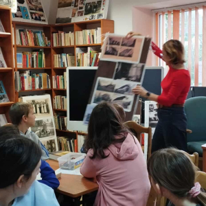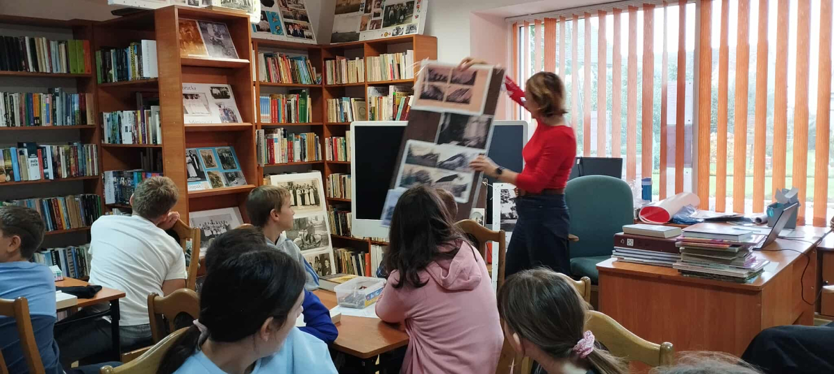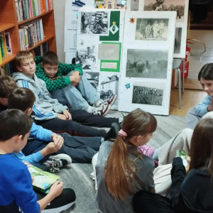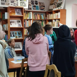 Kolejnym punktem wizyty było zwiedzanie wystawy pt. „Czar minionych lat”, która prezentowała fotografie przekazane przez mieszkańców gminy. Zdjęcia ukazywały życie codzienne dawnych pokoleń, m.in. śluby, uroczystości rodzinne oraz pierwszych osadników ze Wschodu. W ramach podsumowania zajęć uczniowie wykonali prace plastyczne – portrety swoich prapradziadków – łącząc w ten sposób elementy historii rodzinnej z twórczym działaniem.