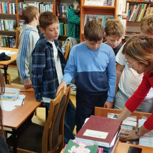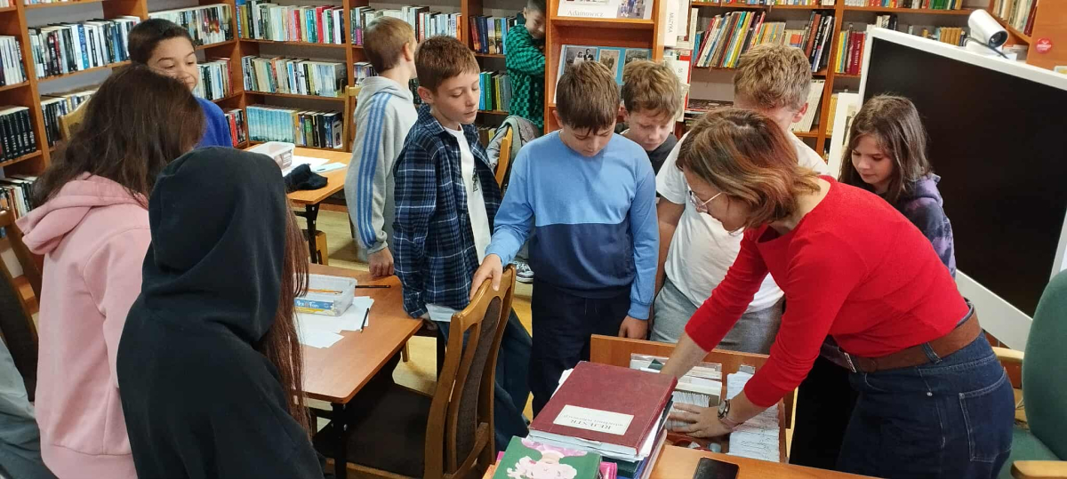 Podczas spotkania uczniowie mieli okazję poznać funkcjonowanie biblioteki „od podszewki”. Pani Marta szczegółowo przedstawiła, jak wygląda praca bibliotekarza, kto może zostać czytelnikiem biblioteki, jak przebiega proces zapisu oraz jakie zbiory znajdują się w placówce. Uczniowie dowiedzieli się również, w jaki sposób katalogowane są nowości wydawnicze, jak uporządkowane są księgozbiory na półkach oraz jak prowadzona jest dokumentacja odwiedzin. Duże zainteresowanie wzbudziła najstarsza księga inwentarzowa, stanowiąca ważny element historii biblioteki. Część warsztatowa zajęć umożliwiła uczniom samodzielne założenie kart bibliotecznych dla nowo zakupionych książek – każde dziecko miało możliwość wybrać tytuł, spisać dane bibliograficzne i prawidłowo uzupełnić kartę. Działanie to nie tylko wprowadziło uczniów w tajniki pracy bibliotekarza, ale także pozwoliło im poczuć realny wpływ na funkcjonowanie biblioteki.