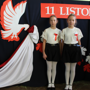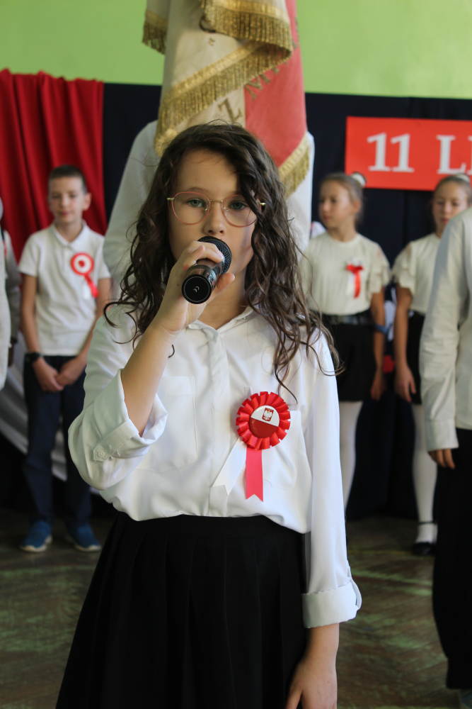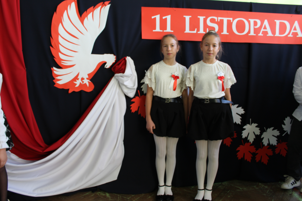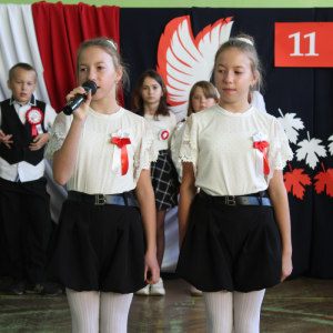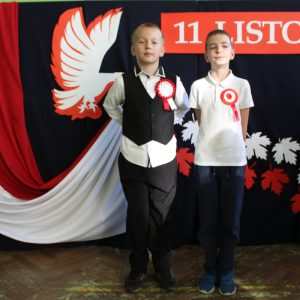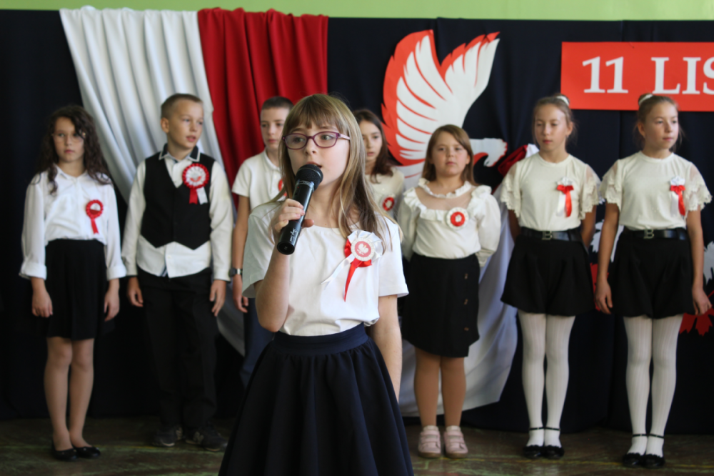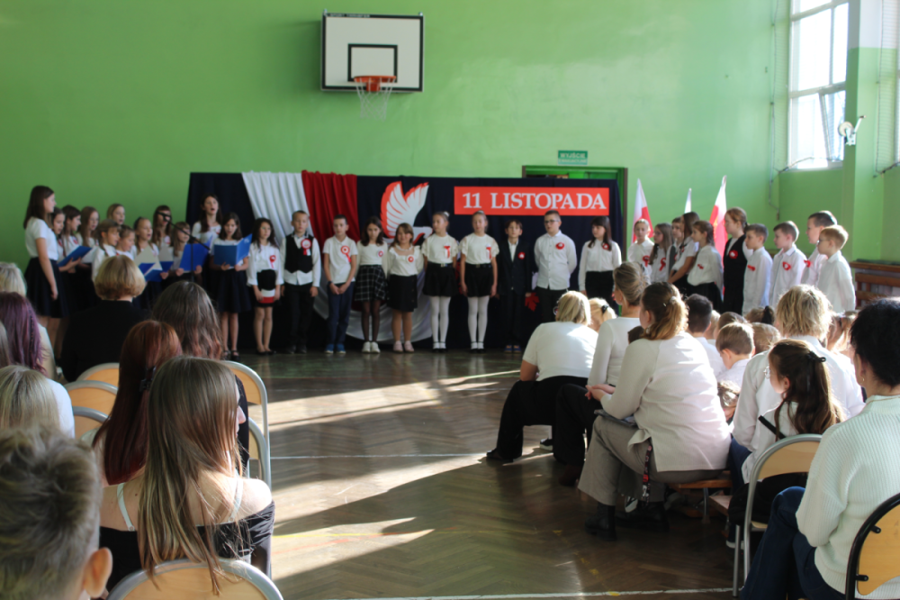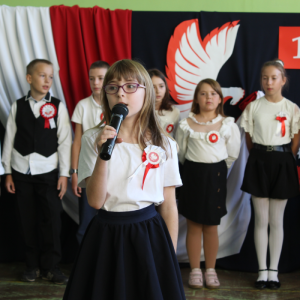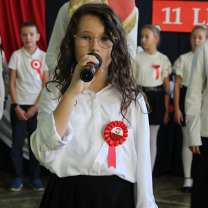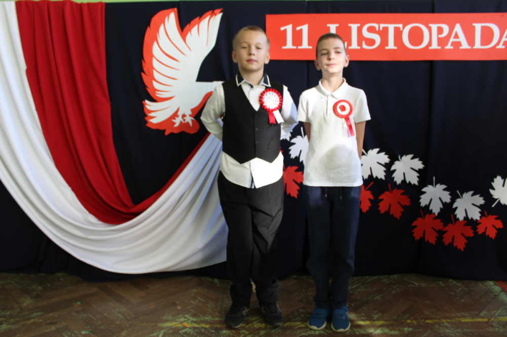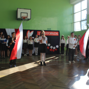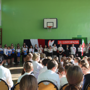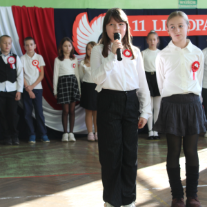 Z tej właśnie okazji 7 listopada w naszej szkole odbyła się uroczysta akademia, przygotowana przez uczniów klasy czwartej pod opieką swojej wychowawczyni- pani Iwony Kubickiej. Wystąpiło 24 uczniów, którzy z ogromnym zaangażowaniem i powagą zaprezentowali piękną część artystyczną poświęconą Ojczyźnie. Uroczystość rozpoczął Piotr, przewodniczący Samorządu Uczniowskiego, który serdecznie powitał wszystkich zebranych – dyrekcję, nauczycieli, uczniów oraz pracowników szkoły. Następnie przypomniał krótki rys historyczny święta, a następnie poprosił wszystkich o uczczenie chwilą ciszy pamięci poległych i walczących o niepodległość. Po wprowadzeniu sztandaru szkoły i odśpiewaniu Mazurka Dąbrowskiego, przewodniczący szkoły odebrał raport klas przy sztandarze, po czym zaprosił wszystkich do obejrzenia części artystycznej.