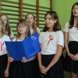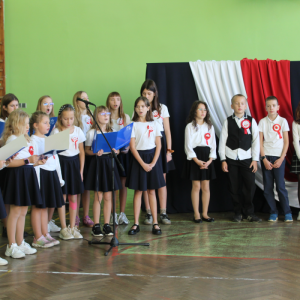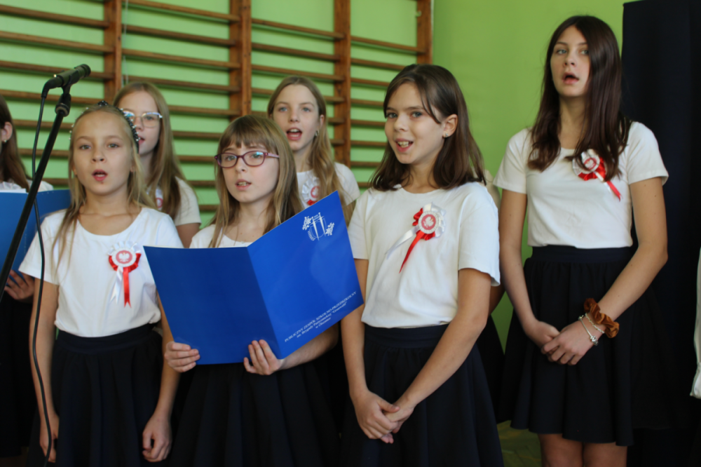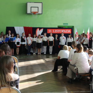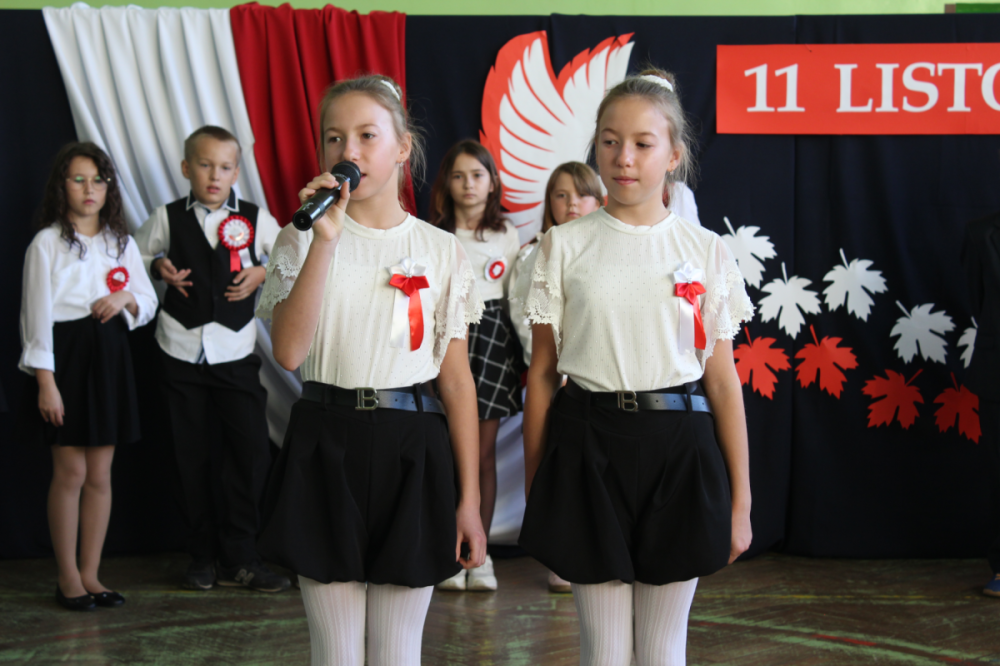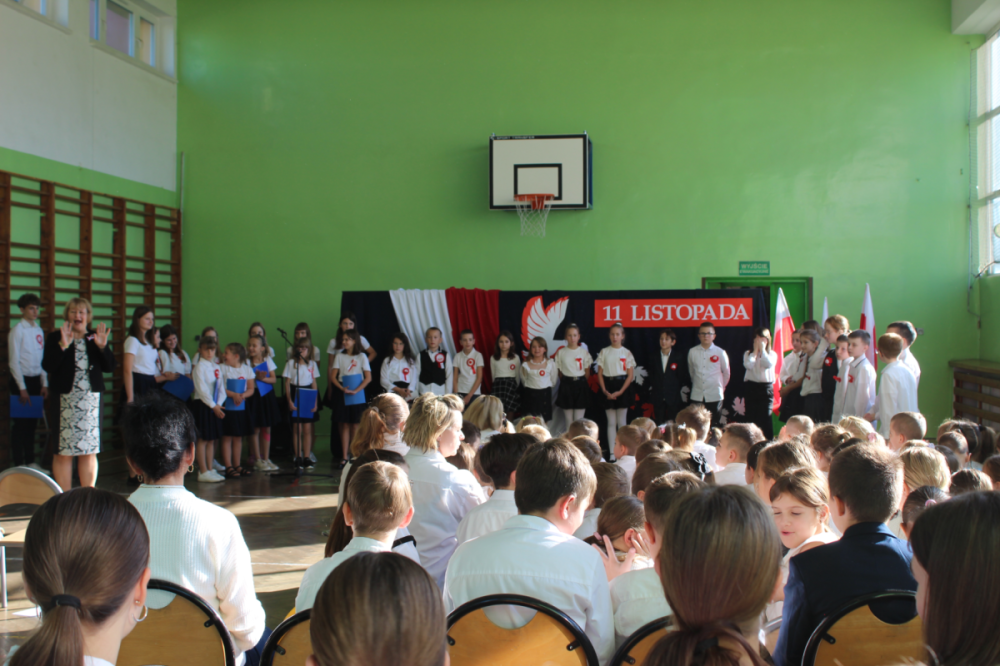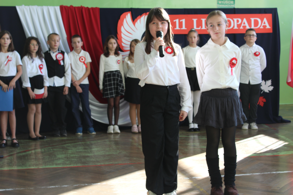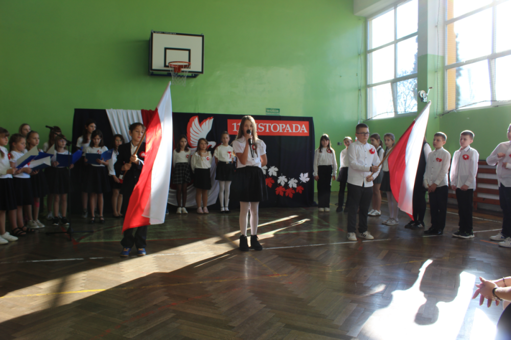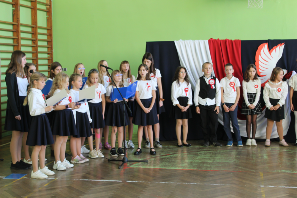 W swoim występie uczniowie klasy czwartej przypomnieli trudną drogę Polaków do odzyskania niepodległości. W wierszach i scenkach ukazali bohaterstwo naszych przodków, którzy mimo zaborów, prześladowań i rozłąki nigdy nie utracili wiary w wolną Polskę. Szczególnie ciepło wspomniano Józefa Piłsudskiego – wielkiego przywódcę i patriotę, który odegrał kluczową rolę w dziele odzyskania niepodległości. Podczas akademii zaprezentowano także symbole narodowe: godło, flagę i hymn Polski. Uczniowie pięknie wyjaśnili ich znaczenie, przypominając, że to właśnie one łączą wszystkich Polaków – tych dawnych i współczesnych. Występ artystyczny wzbogacił śpiew szkolnego zespołu „Słowiki”, którego opiekunem była pani Beata Bajcer. Chór w niezwykle wzruszający sposób wykonał pieśni patriotyczne: „Legiony”, „Polska flaga”, „Co to jest niepodległość?” oraz „11 listopada”. Ich czyste głosy i pełne emocji wykonanie poruszyły serca wszystkich obecnych. Na zakończenie całe zgromadzenie wspólnie odśpiewało „Rotę” – pieśń, która od pokoleń przypomina o miłości i wierności Ojczyźnie.
