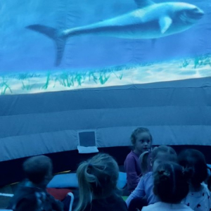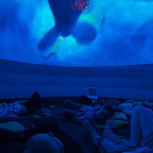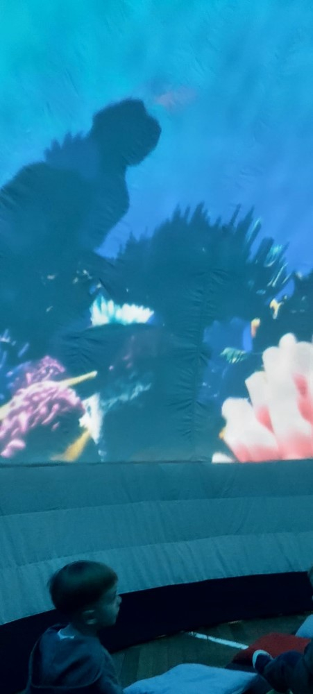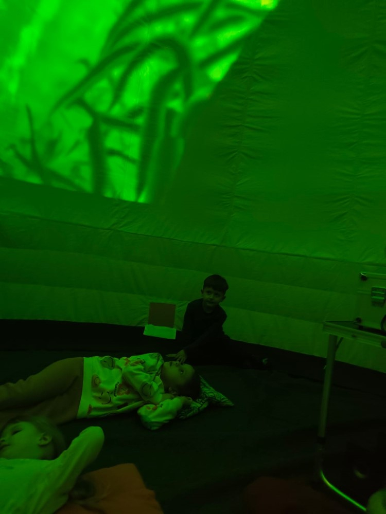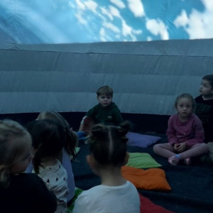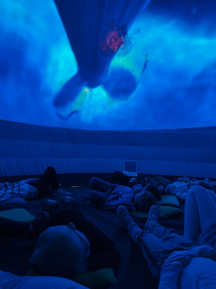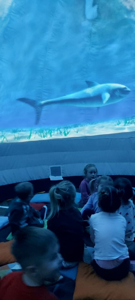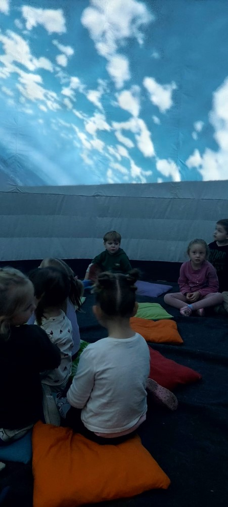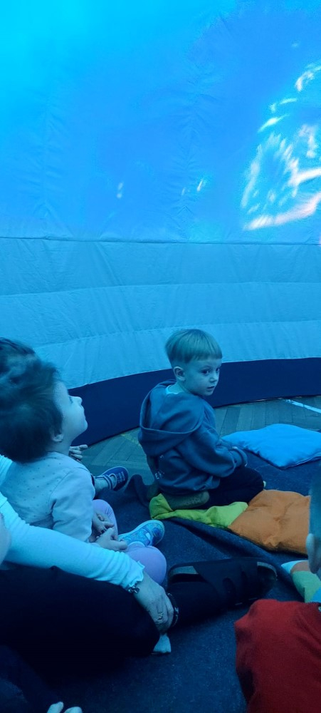 Przedszkole to miejsce, w którym wyobraźnia dzieci nie zna granic. Wyjątkowym sposobem na rozwijanie tej wyobraźni okazuje się być kino sferyczne – nowoczesna forma edukacji i rozrywki, która umożliwia najmłodszym odbycie wirtualnych podróży w przestrzeni 360 stopni. To właśnie 26.02.2026r. nasze przedszkolaki miały okazję gościć mobilne kino sferyczne, które zaoferowało dzieciom niezwykłe doświadczenia filmowe. Dzieci mogły wejść do kopuły, w środku której wyświetlane były filmy . Na ekranie pojawiły się zapierające dech w piersiach widoki kosmosu oraz tajemnicze podwodne krajobrazy. Kino sferyczne w przedszkolu to doskonały przykład połączenia nowoczesnej technologii z edukacją. Filmy o kosmosie i podwodnych głębinach nie tylko bawią, ale także uczą, inspirując najmłodszych do odkrywania świata.