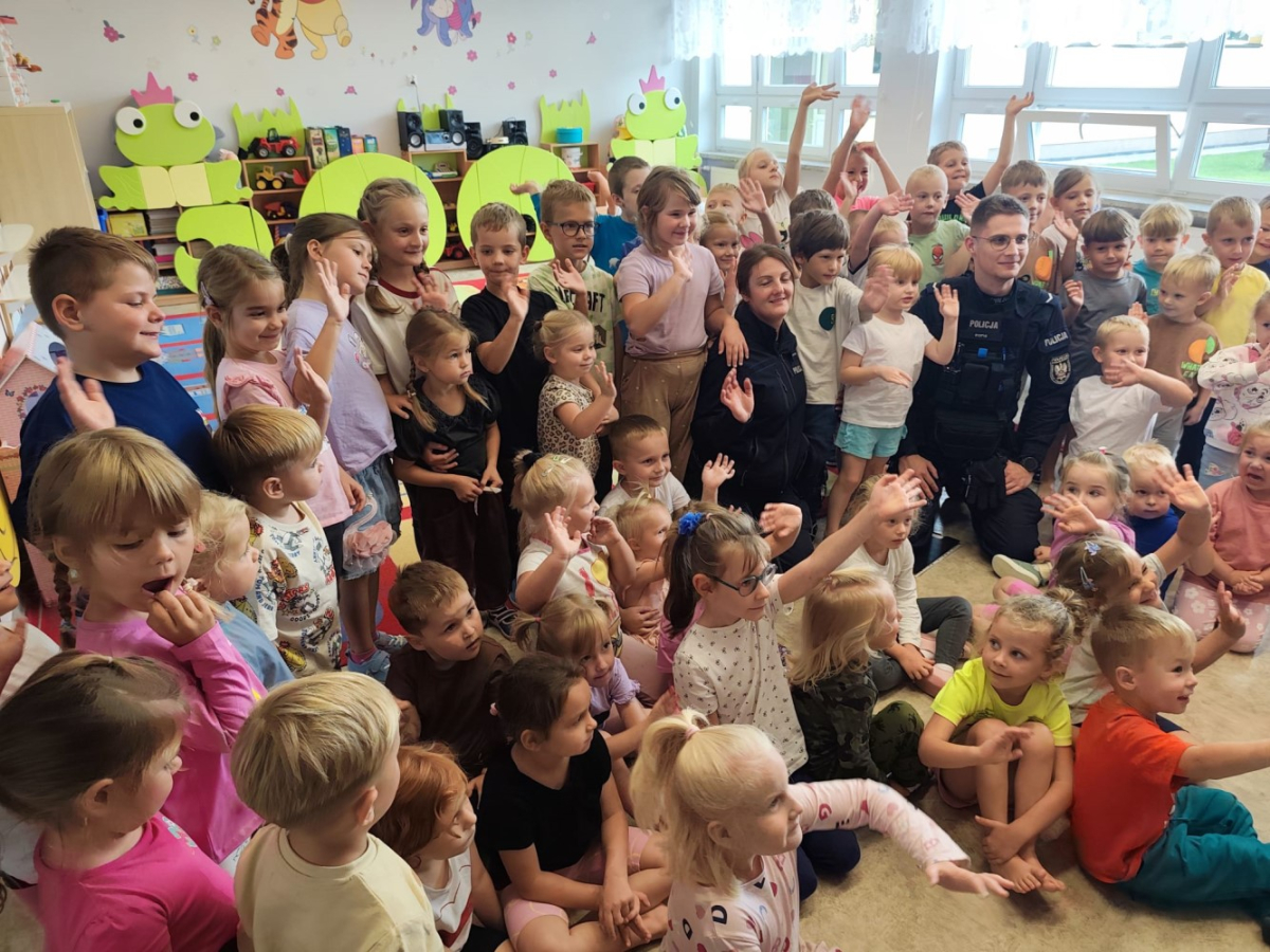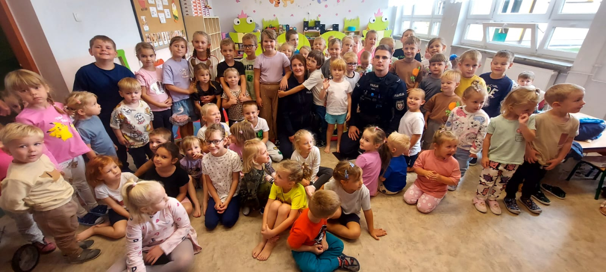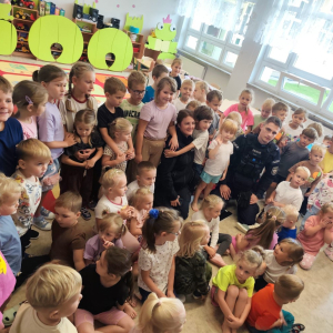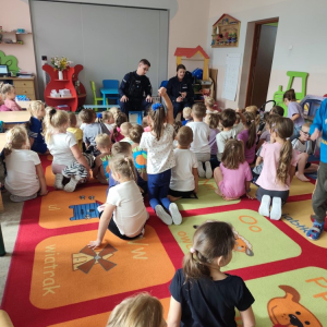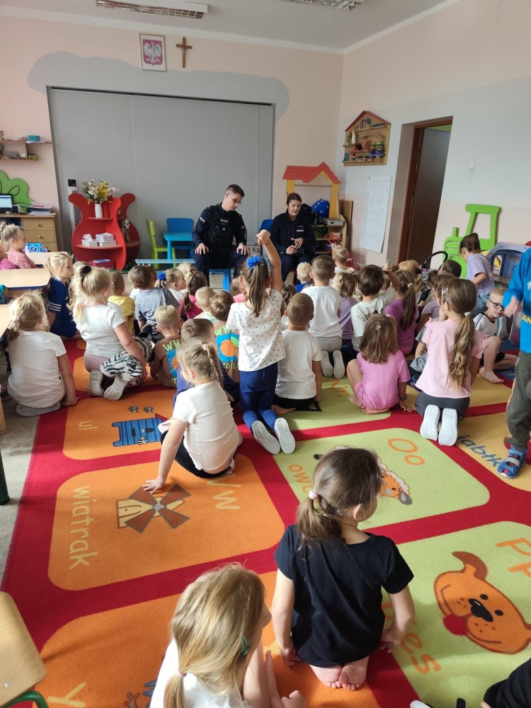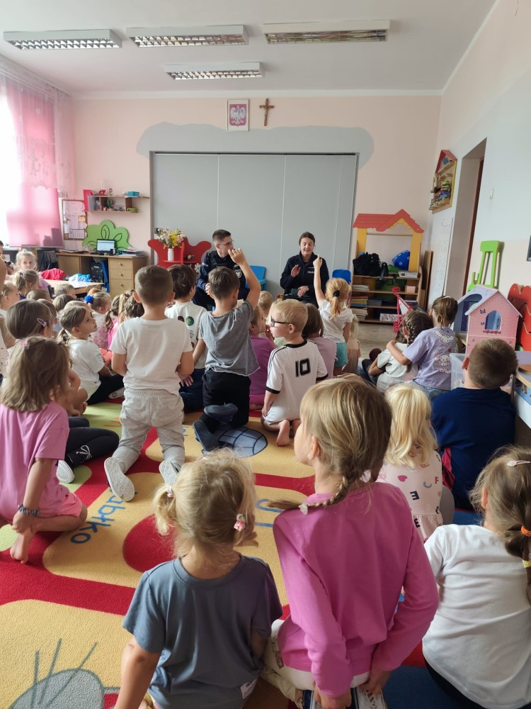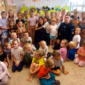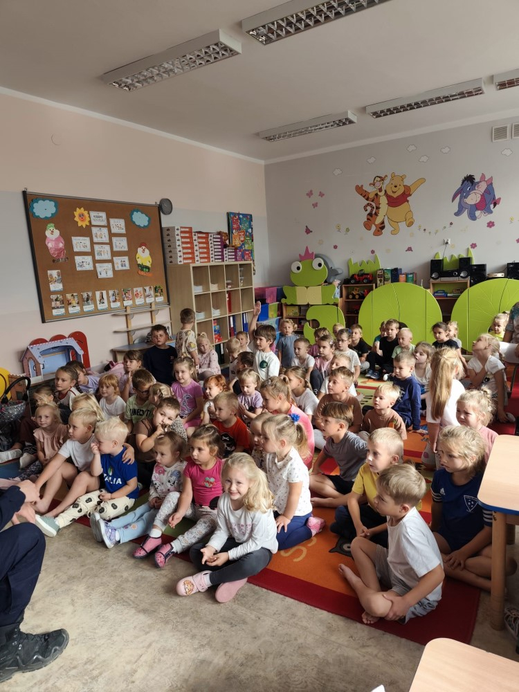 18 września w naszym przedszkolu odbyło się spotkanie z policjantem z Komisariatu Policji w Lewinie Brzeskim. Tematem spotkania było utrwalenie z dziećmi zasad ruchu drogowego oraz przypomnienie zagadnień dotyczących bezpieczeństwa dzieci w przedszkolu i w domu. Pan policjant, przypomniał podstawowe zasady zachowania się podczas przechodzenia przez jezdnię. Następnie wytłumaczył jak należy zachować się w kontaktach z obcymi ludźmi, jak dbać o bezpieczeństwo własne i innych oraz do kogo zwracać się o pomoc w sytuacji zagrożenia. Dzieci z dużym zainteresowaniem słuchały rad i wskazówek zaproszonego gościa.