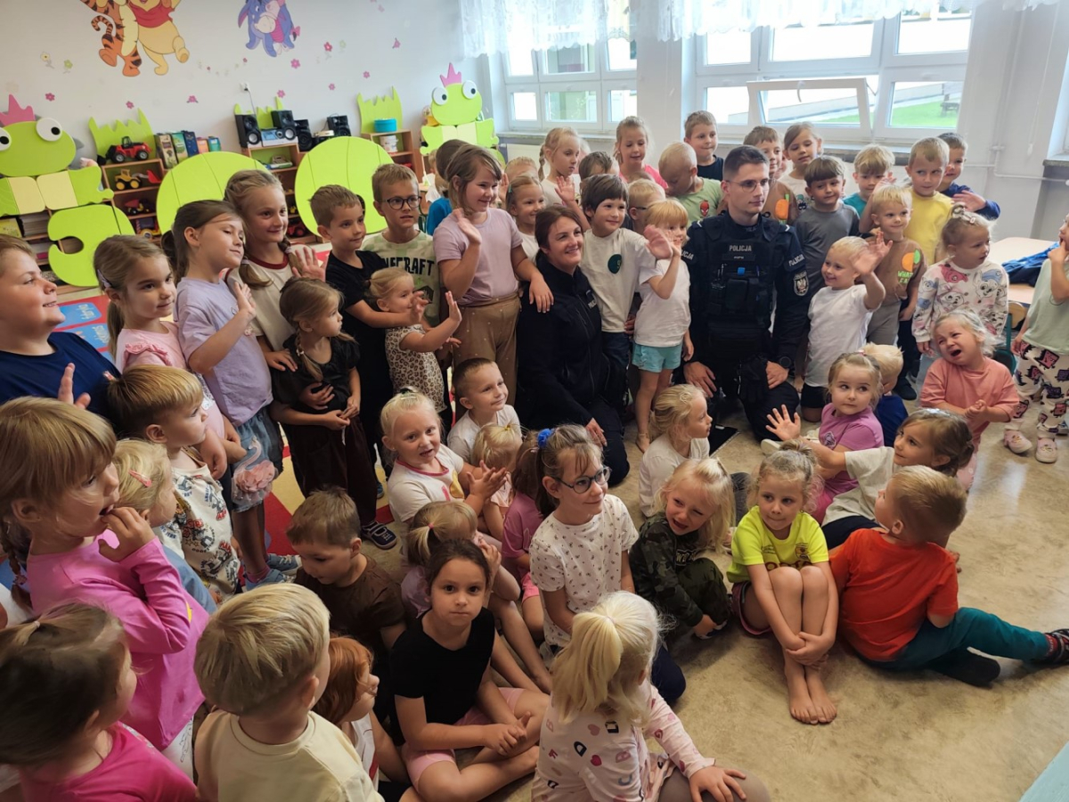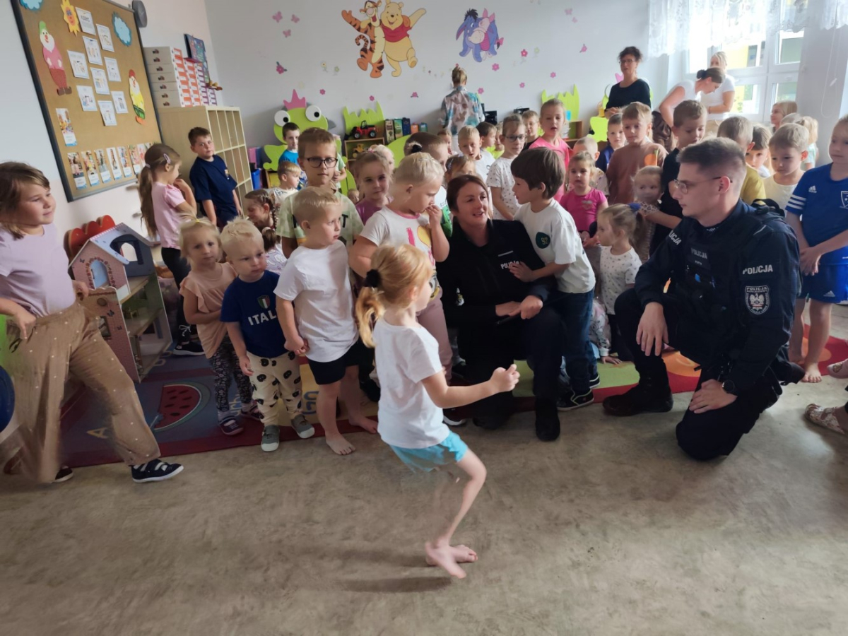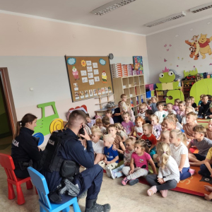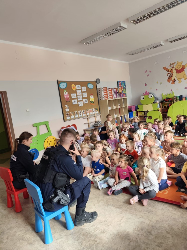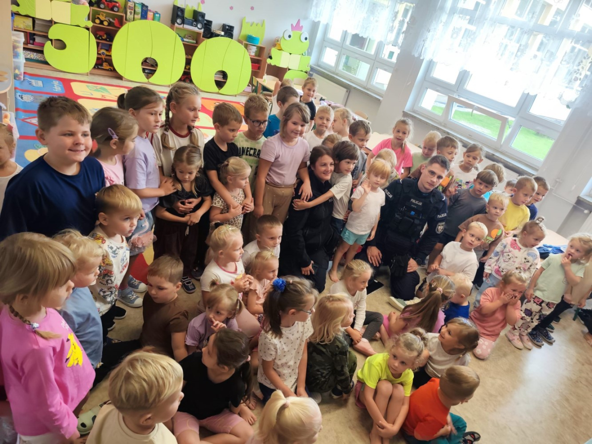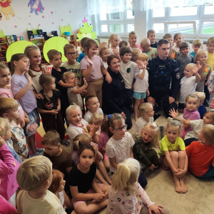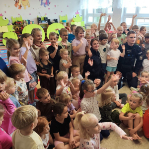 18 września w naszym przedszkolu odbyło się spotkanie z policjantem z Komisariatu Policji w Lewinie Brzeskim. Tematem spotkania było utrwalenie z dziećmi zasad ruchu drogowego oraz przypomnienie zagadnień dotyczących bezpieczeństwa dzieci w przedszkolu i w domu. Pan policjant, przypomniał podstawowe zasady zachowania się podczas przechodzenia przez jezdnię. Następnie wytłumaczył jak należy zachować się w kontaktach z obcymi ludźmi, jak dbać o bezpieczeństwo własne i innych oraz do kogo zwracać się o pomoc w sytuacji zagrożenia. Dzieci z dużym zainteresowaniem słuchały rad i wskazówek zaproszonego gościa.