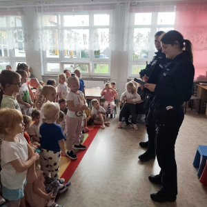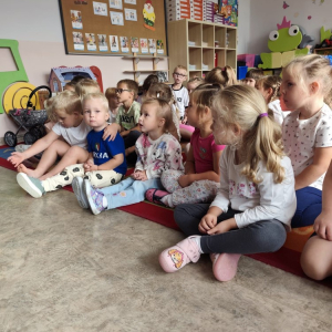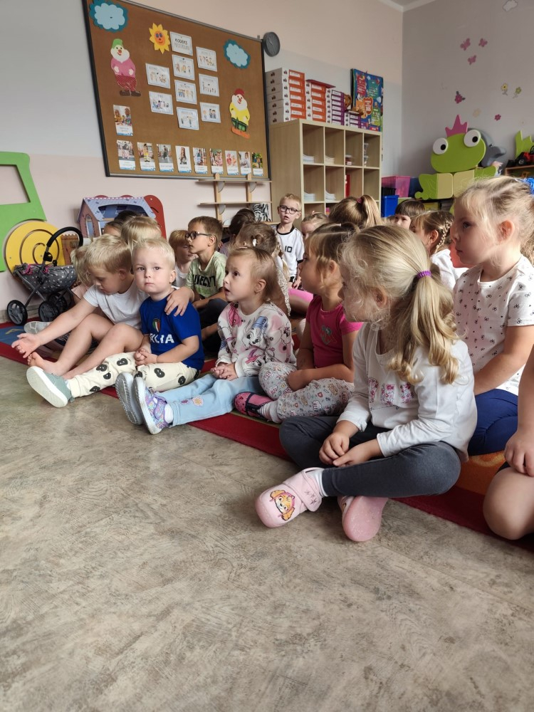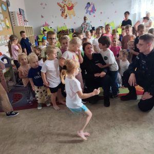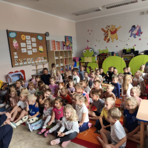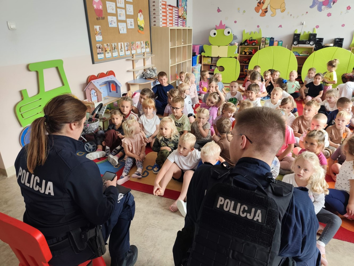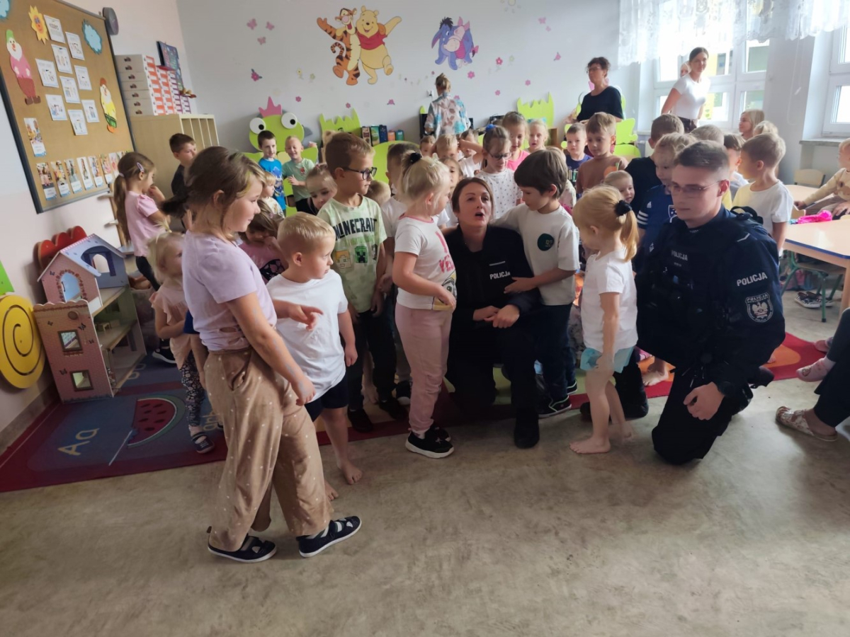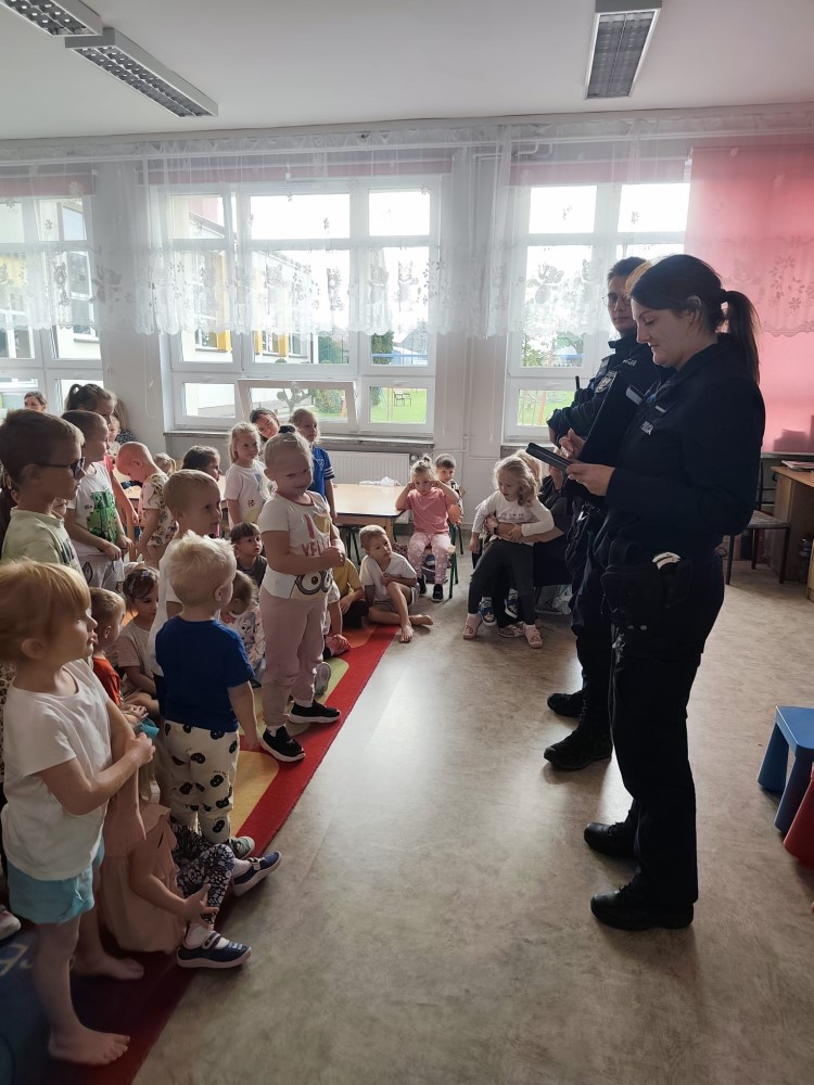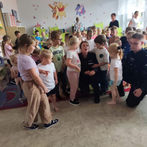 18 września w naszym przedszkolu odbyło się spotkanie z policjantem z Komisariatu Policji w Lewinie Brzeskim. Tematem spotkania było utrwalenie z dziećmi zasad ruchu drogowego oraz przypomnienie zagadnień dotyczących bezpieczeństwa dzieci w przedszkolu i w domu. Pan policjant, przypomniał podstawowe zasady zachowania się podczas przechodzenia przez jezdnię. Następnie wytłumaczył jak należy zachować się w kontaktach z obcymi ludźmi, jak dbać o bezpieczeństwo własne i innych oraz do kogo zwracać się o pomoc w sytuacji zagrożenia. Dzieci z dużym zainteresowaniem słuchały rad i wskazówek zaproszonego gościa.
